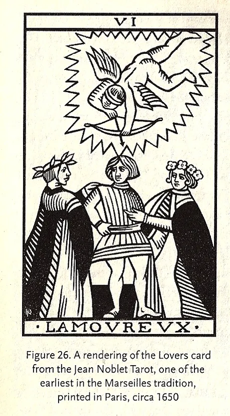 恋人牌有两个视觉传统。马赛塔罗中这张牌的原名是 L’Amoureux(单数的恋人),牌面是一个男子站在两个女人之间做选择,构图可追溯到「赫拉克勒斯在十字路口」的古典寓言。恋人牌的基本牌义是「选择」,作为大阿尔卡纳的第 VI 号牌,它指向的是足以改写人生轨迹的重大决定。