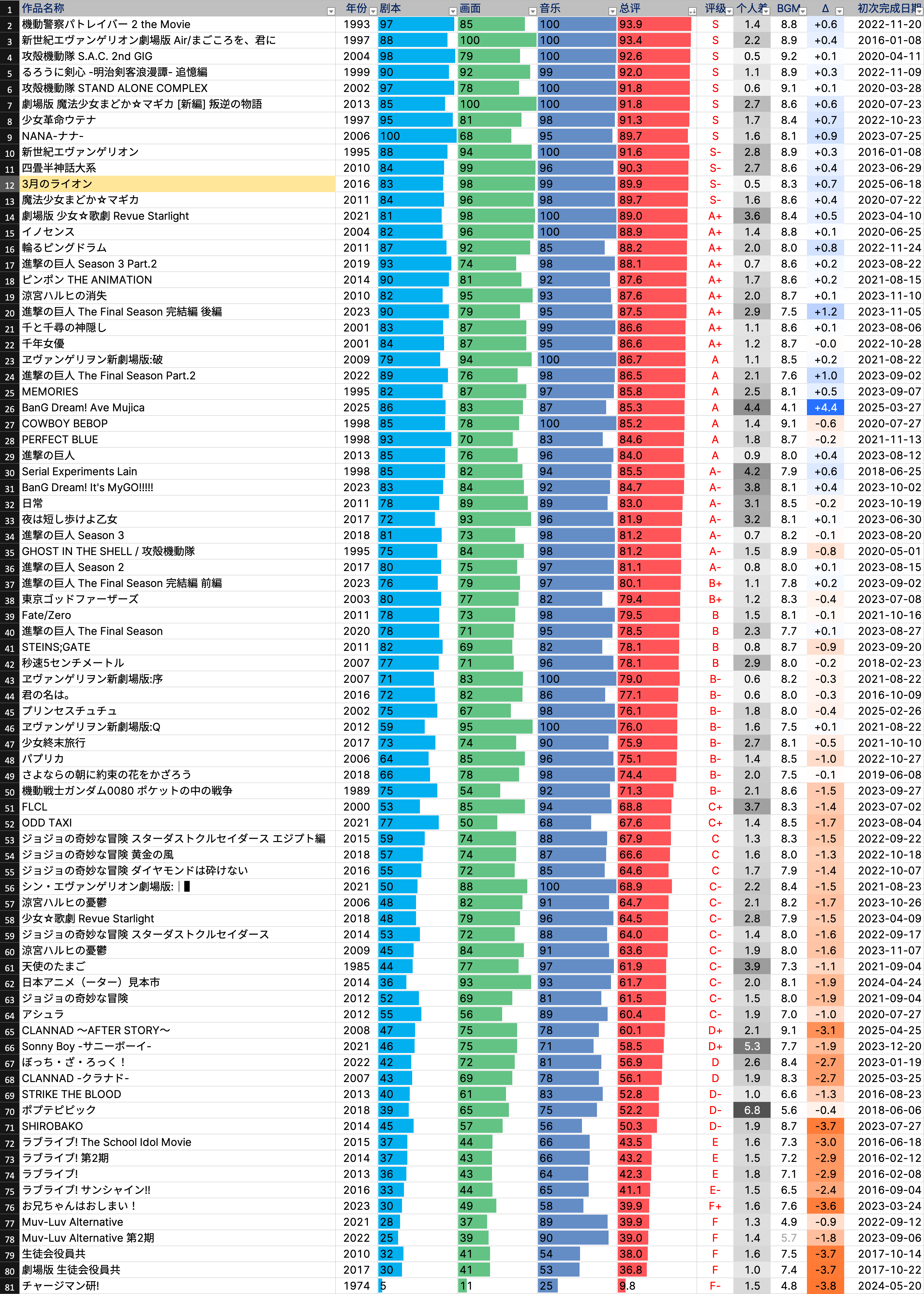 心血来潮,参照 AVG 个人评测数据 做了一个动画版的评分表。主观评价,仅供参考。已抛弃作品不会出现在表中。