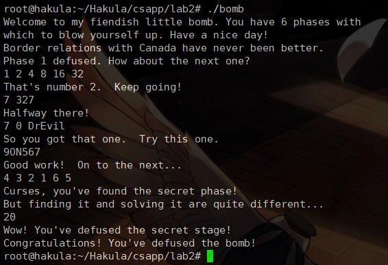 我并没有使用 IDA Pro 反汇编工具,报告里出现的所有 C 语言代码都是我逐行阅读汇编代码、慢慢人工整理得到的,也没有参考任何网上的文章。不得不说这着实让我对汇编的理解与熟悉程度上了一个台阶。实验过程虽然漫长,但也挺有趣的,CMU 能设计出这样一套寓教于乐的 Lab 真的很有水平。